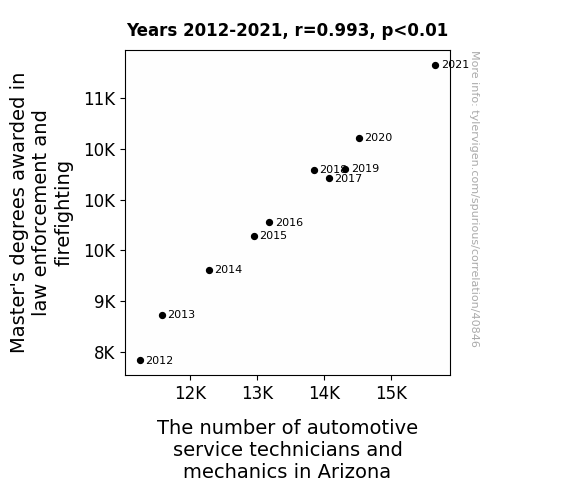 This means 98.6% of the change in the one variable (i.e., The number of automotive service technicians and mechanics in Arizona) is predictable based on the change in the other (i.e., Master's degrees awarded in law enforcement and firefighting) over the 10 years from 2012 through 2021.