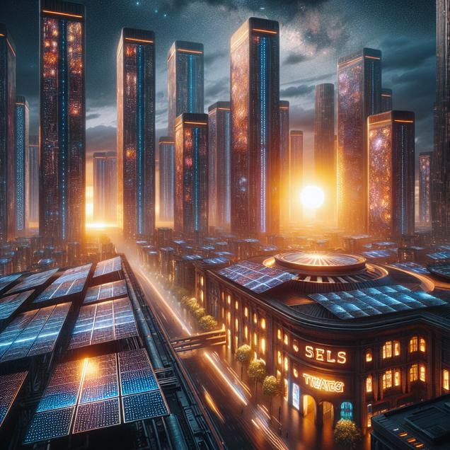 ChatGPT: Generate an image of a futuristic cityscape in Croatia, with sleek, towering buildings adorned with vibrant solar panels glimmering under the intense sunlight. In the foreground, show the solar panels capturing the radiant energy, and in the distance, depict theaters with dimming lights and ticket prices displayed, symbolic of the impact of the solar energy shift on conventional power consumption.