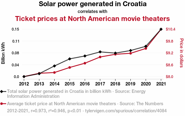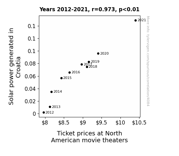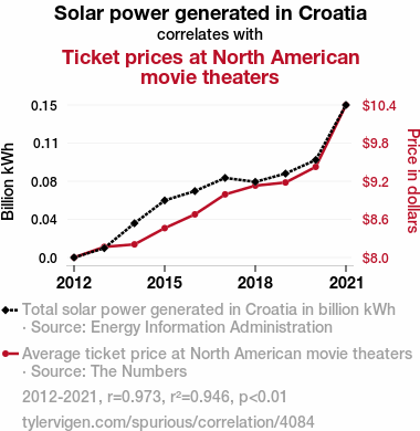 This means 94.6% of the change in the one variable (i.e., Ticket prices at North American movie theaters) is predictable based on the change in the other (i.e., Solar power generated in Croatia) over the 10 years from 2012 through 2021.
