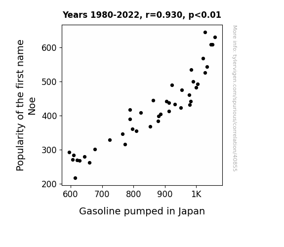 This means 86.5% of the change in the one variable (i.e., Gasoline pumped in Japan) is predictable based on the change in the other (i.e., Popularity of the first name Noe) over the 43 years from 1980 through 2022.