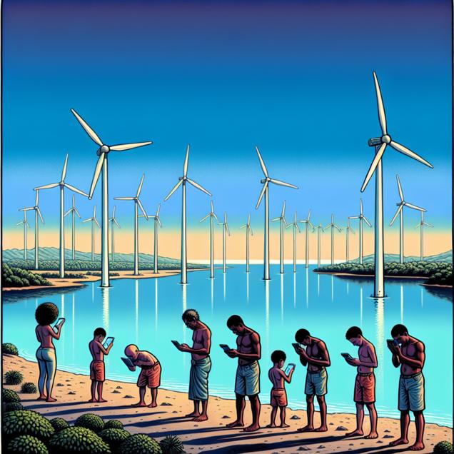 ChatGPT: Create an image of a landscape in Fiji, with a clear blue sky and a line of wind turbines standing still in the absence of wind. In the foreground, depict people lowering their phones and computers, with diminishing Google searches for 'Stand-Up Maths'. Show the once lively wind turbines now silent, and the waning interest in Stand-Up Maths.
