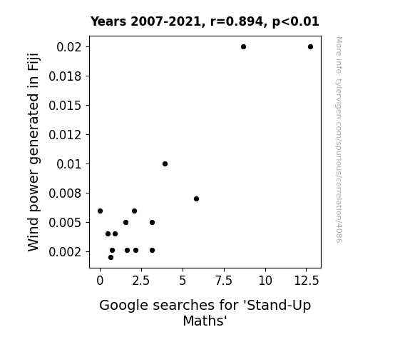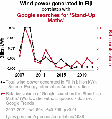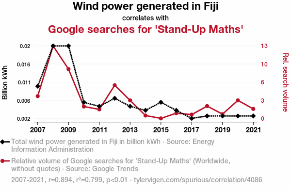 - The spurious research paper: The Winds of Fiji: A Stand-Up Correlation Between Wind Power Generation and Google Searches for 'Stand-Up Maths'