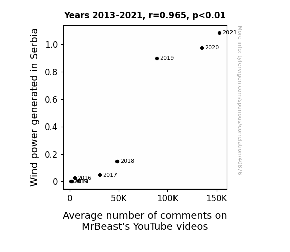 This means 93.2% of the change in the one variable (i.e., Average number of comments on MrBeast's YouTube videos) is predictable based on the change in the other (i.e., Wind power generated in Serbia) over the 9 years from 2013 through 2021.