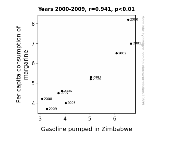 This means 88.5% of the change in the one variable (i.e., Gasoline pumped in Zimbabwe) is predictable based on the change in the other (i.e., Per capita consumption of margarine) over the 10 years from 2000 through 2009.