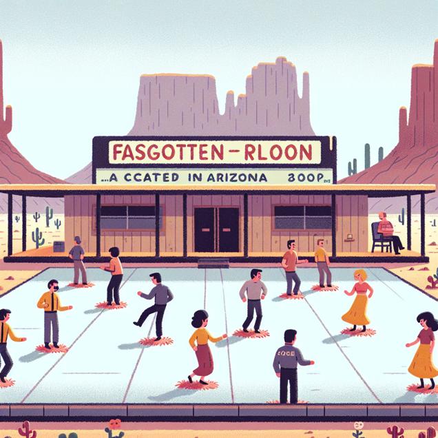 Prompt: Prompt: Generate a cute 2D animation depicting a deserted dance floor in Arizona, with neglected shag carpets and a diminishing number of people named Alfonso dancing. Show the once vibrant scene now appearing empty and desolate, capturing the fading of the dance-themed carpet installation industry. The depiction should include only scenes, people, and objects, it should not include text or speech bubbles.