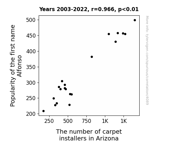 Alfonso name popularity, carpet installers Arizona, correlation coefficient Alfonso carpet installers, US Social Security Administration data, Bureau of Labor Statistics Arizona, occupational nomenclature, statistical analysis name popularity, whimsical correlations, Arizona occupational distribution
