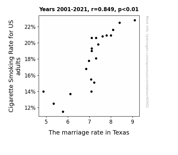 This means 72% of the change in the one variable (i.e., The marriage rate in Texas) is predictable based on the change in the other (i.e., Cigarette Smoking Rate for US adults) over the 21 years from 2001 through 2021.
