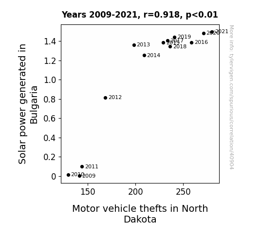 This means 84.3% of the change in the one variable (i.e., Motor vehicle thefts in North Dakota) is predictable based on the change in the other (i.e., Solar power generated in Bulgaria) over the 13 years from 2009 through 2021.