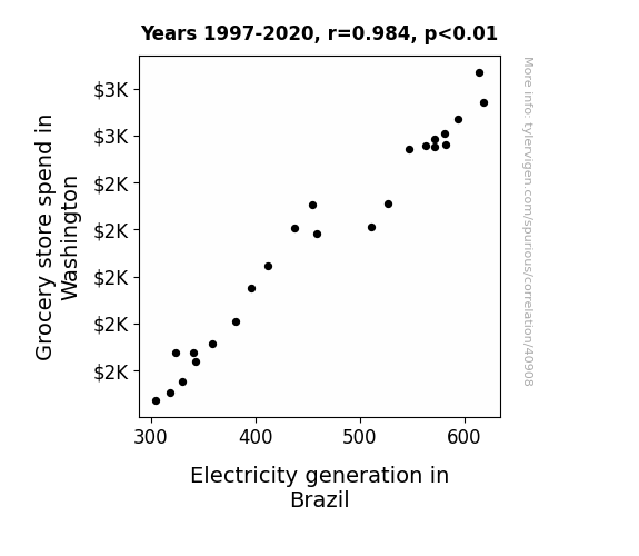 This means 96.9% of the change in the one variable (i.e., Electricity generation in Brazil) is predictable based on the change in the other (i.e., Grocery store spend in Washington) over the 24 years from 1997 through 2020.