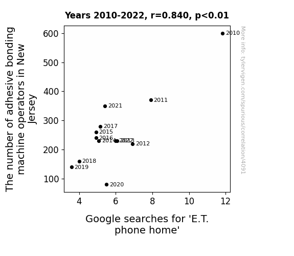 - The spurious research paper: Stick With Me, E.T.: The Link Between Adhesive Bonding Machine Operators in New Jersey and 'E.T. Phone Home' Google Searches