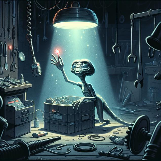 Prompt: [An image that looks like it is a scene from a Pixar movie] Create an illustration of a dimly lit workshop, showing E.T. with his glowing finger reaching towards a phone that is beginning to slip from his grasp. Everyday objects around the workshop, such as tools and gadgets, are portrayed as if they are losing their stickiness and start to drift away. The subdued lighting and E.T.'s hopeful yet frustrated expression convey the urgency of his failed attempt to contact home without the aid of the adhesive bonding machine operators. The depiction should include only scenes, people, and objects, it should not include text or speech bubbles.