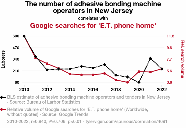 A linear line chart with years as the X-axis and two variables on the Y-axis. The first variable is The number of adhesive bonding machine operators in New Jersey and the second variable is Google searches for 'E.T. phone home'.  The chart goes from 2010 to 2022, and the two variables track closely in value over that time. Small Image