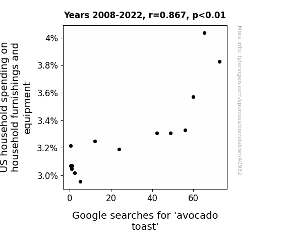 This means 75.2% of the change in the one variable (i.e., Google searches for 'avocado toast') is predictable based on the change in the other (i.e., US household spending on household furnishings and equipment) over the 15 years from 2008 through 2022.