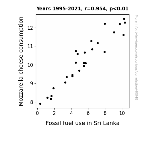 This means 91.1% of the change in the one variable (i.e., Fossil fuel use in Sri Lanka) is predictable based on the change in the other (i.e., Mozzarella cheese consumption) over the 27 years from 1995 through 2021.