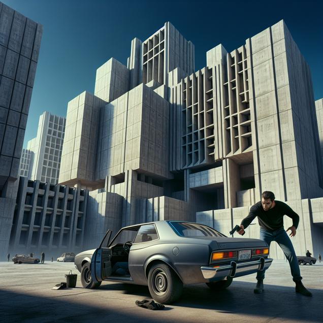 Prompt: Create an image of a stark, imposing cityscape dominated by brutalist architecture. The clear blue sky above El Centro, California, provides a sharp contrast to the brutalist buildings. In the foreground, a car thief appears frustrated as they struggle to start a stolen vehicle, their unsuccessful getaway hindered by the unexpected lack of smog. The tension of the moment is highlighted by the harsh, angular lines of the buildings and the open, unobstructed sky. The depiction should include only scenes, people, and objects, it should not include text or speech bubbles.