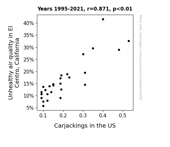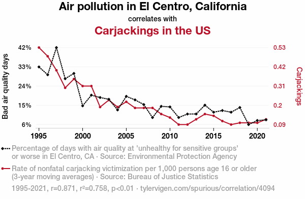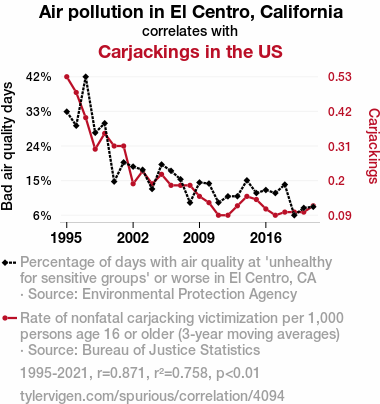 - The spurious research paper: Clearing the Air: Uncovering the Smoggy Link Between Air Pollution in El Centro, California, and Carjackings in the US