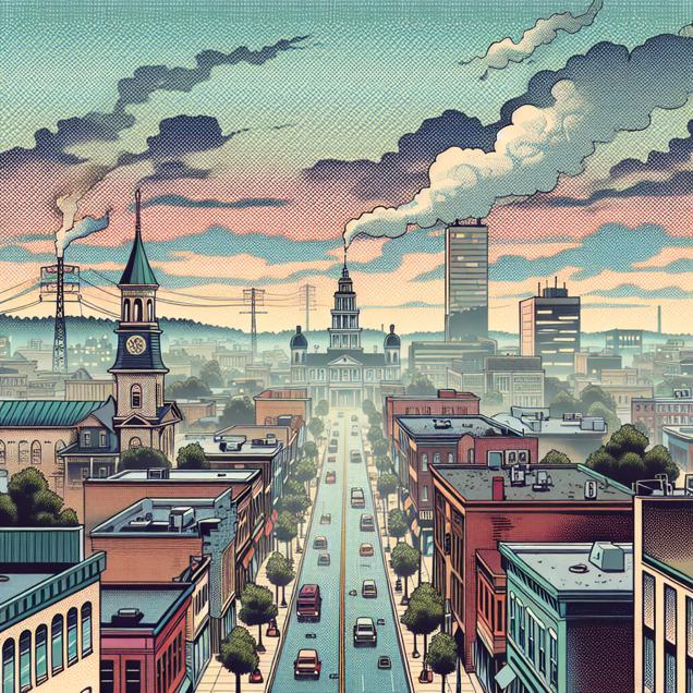 User prompt: Please respond with an image generation prompt that would be likely to create an interesting visual using DALLE-3, using the following style: [ A comic-book-style illustration with muted colors and a dotted halftone pattern from the 1960s ] and depicting this scene: In Hagerstown, Maryland, the once hazy sky suddenly cleared up as the air pollution diminished. As the air became cleaner, it also grew lighter, causing the atmospheric pressure to decrease. This change reflected in Johnson Controls International's stock price, which followed suit and dropped as the pressure decreased. Keep the visual depiction simple. Do not include any words or speech bubbles.