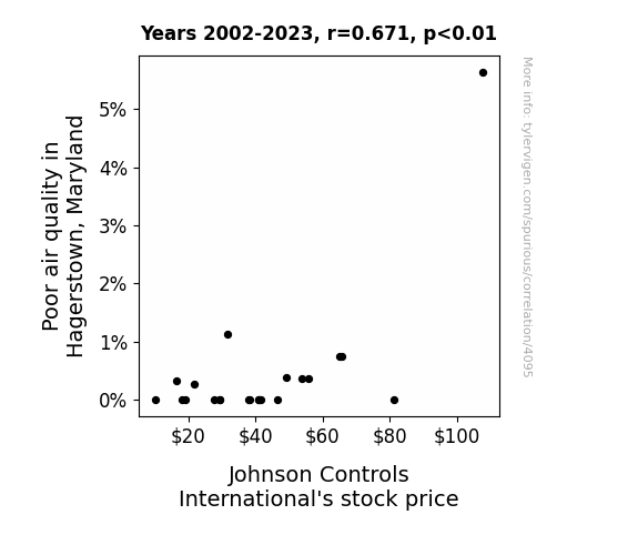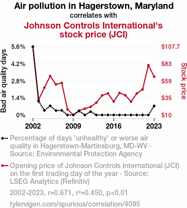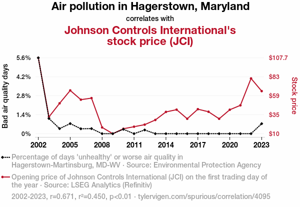 This means 45% of the change in the one variable (i.e., Johnson Controls International's stock price (JCI)) is predictable based on the change in the other (i.e., Air pollution in Hagerstown, Maryland) over the 22 years from 2002 through 2023.