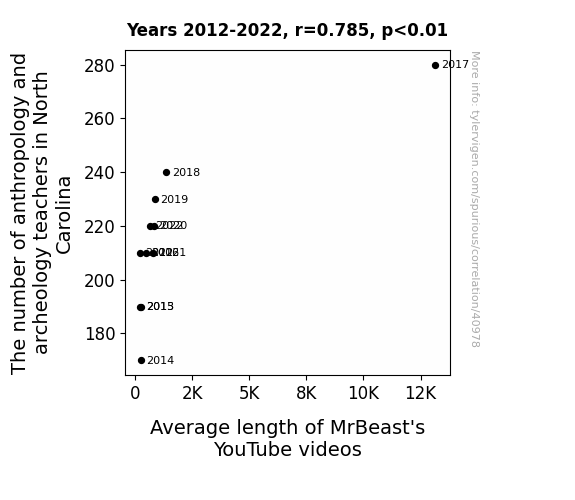 This means 61.7% of the change in the one variable (i.e., Average length of MrBeast's YouTube videos) is predictable based on the change in the other (i.e., The number of anthropology and archeology teachers in North Carolina) over the 11 years from 2012 through 2022.