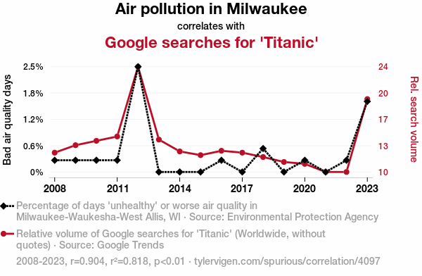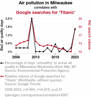 - The spurious research paper: Milwaukee Air Pollution's Influence on 'Titanic' Google Searches: A Statistical Seasaw