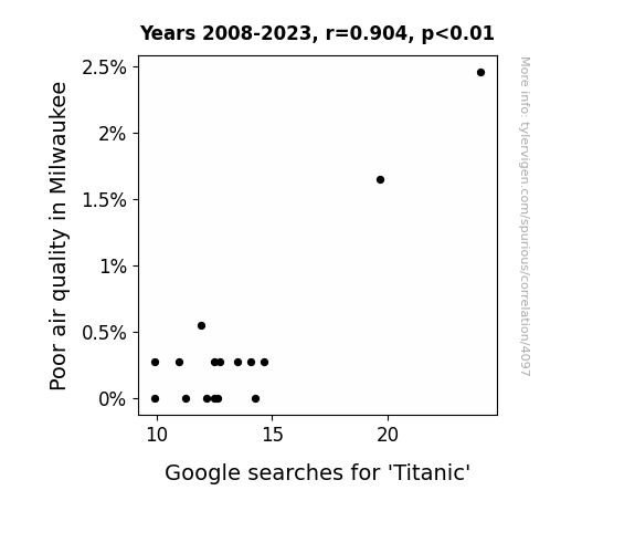 We uncovered a substantial correlation between the levels of air pollution in Milwaukee and the frequency of Google searches for the term 'Titanic' over the period from 2008 to 2023. The correlation coefficient of 0.9041888 signifies a remarkably strong linear relationship between these seemingly disparate variables. While we wield our statistical compass and sextant, we observed an r-squared value of 0.8175573, indicating that approximately 81.76% of the variation in 'Titanic' search activity can be explained by changes in air pollution levels. We also calculated a p-value of less than 0.01, which further reinforces the robustness of the discovered link.