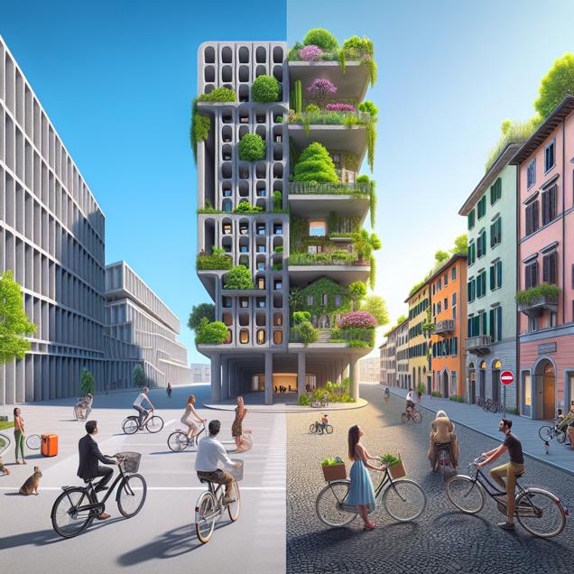 Prompt: Generate an image of a cityscape that juxtaposes the urban scenes of Columbus and Italy. In the Columbus portion, portray a modern, brutalist building standing tall against the clear blue sky, with green spaces and people leisurely walking and riding bicycles. Contrast this with an Italian street scene where quaint buildings line the road, adorned with vibrant greenery and adorned with bicycles. Show gas stations with fewer cars, and Italian tree whisperers smiling as they gently guide their fellow citizens towards eco-friendly lifestyle choices. The depiction should include only scenes, people, and objects, it should not include text or speech bubbles.