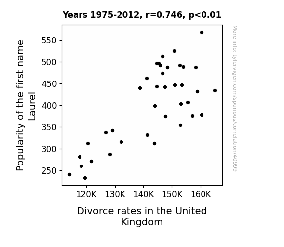 This means 55.7% of the change in the one variable (i.e., Divorce rates in the United Kingdom) is predictable based on the change in the other (i.e., Popularity of the first name Laurel) over the 38 years from 1975 through 2012.