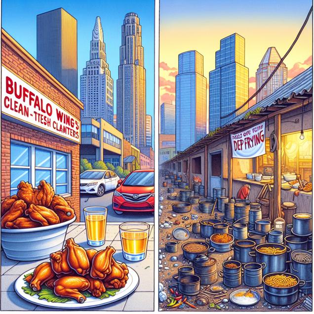 ChatGPT: Prompt: Create an image that juxtaposes the high-tech advancements of Buffalo's cleaner skyline with the traditional, untouched buffalo wing platters in a local restaurant. Meanwhile, in a small market in Peru, showcase the abandoned kerosene cans used for deep frying, capturing the contrast between modern and traditional cooking practices.