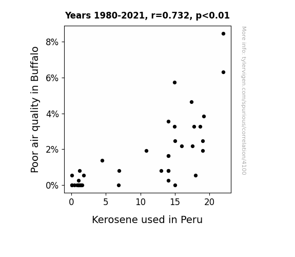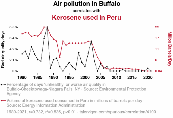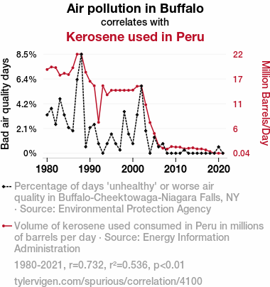 We were either left with a "Buffalo wings effect," where pollution from Buffalo mysteriously wafts its way to Peru and magically affects kerosene use, or perhaps a "Kerosene carryover phenomenon," where the fumes from kerosene are carried away on the wind and contribute to air pollution in far-off Buffalo. Or it may simply be a case of complete statistical happenstance, leaving us scratching our heads and marveling at the statistical equivalent of winning the environmental lottery.