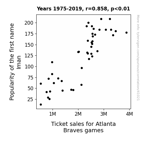 This means 73.7% of the change in the one variable (i.e., Ticket sales for Atlanta Braves games) is predictable based on the change in the other (i.e., Popularity of the first name Iman) over the 45 years from 1975 through 2019.
