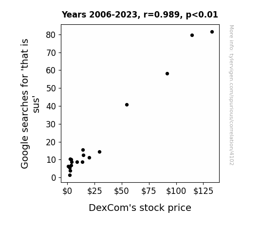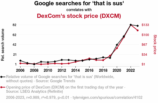 This means 97.9% of the change in the one variable (i.e., DexCom's stock price (DXCM)) is predictable based on the change in the other (i.e., Google searches for 'that is sus') over the 18 years from 2006 through 2023.