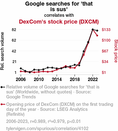 User prompt: Please provide potential search keywords for a paper titled That is Suspect: Investigating the Relationship Between Google Searches for That is Sus and DexCom's Stock Price with an abstract of This study examines the curious connection between Google searches for the phrase "That is sus" and the stock price of DexCom (DXCM). The research team utilized data from Google Trends and LSEG Analytics (Refinitiv) to conduct a thorough investigation from 2006 to 2023. Surprisingly, a strong correlation coefficient of 0.9894753 and a significance level of p < 0.01 were uncovered, indicating a striking relationship between the two seemingly unrelated phenomena. The implications of these findings are far-reaching and may have profound impacts on our understanding of market behavior and social media influence on financial markets. Furthermore, the evident resonance between the peculiar phrase and the stock price sparks intrigue and prompts a broader inquiry into the underlying mechanisms at play.