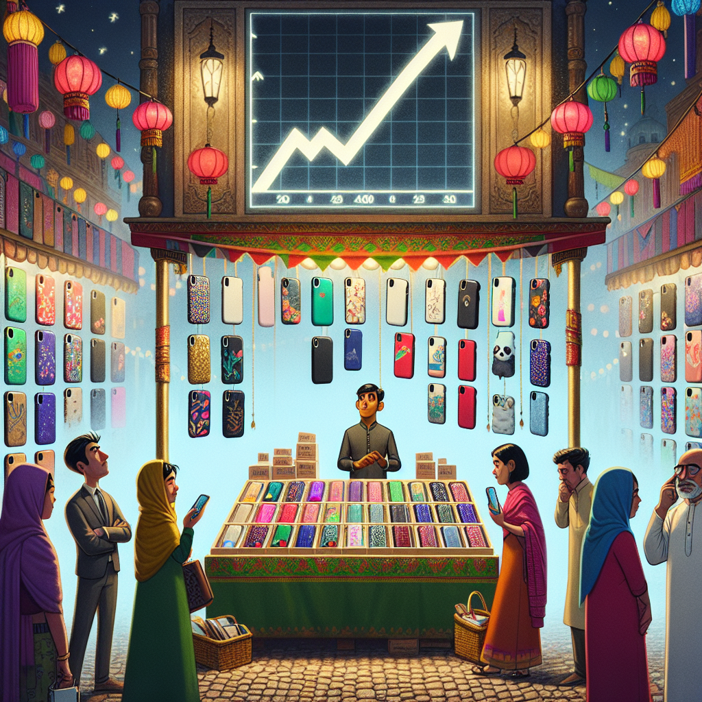 User prompt: Please respond with an image generation prompt that would be likely to create an interesting visual using DALLE-3, using the following style: [ An image that looks like it is a scene from a Pixar movie ] and depicting this scene: In a bustling marketplace, a display of "Anabel" phone cases sits untouched as fewer people pass by. The vendor looks worried as the decrease in demand becomes evident. In the background, a large digital stock ticker shows Vodafone Group's stock price dropping steadily. Investors nearby are seen discussing the impact of the decreased demand for phone accessories on the company's performance. Keep the visual depiction simple. Do not include any words or speech bubbles.