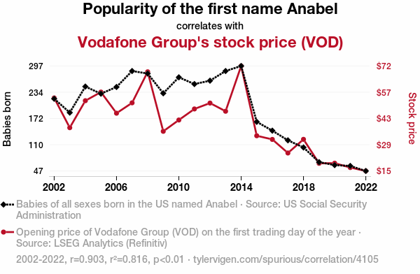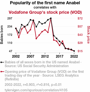 Anabel, Vodafone, stock performance, first name, correlation, US Social Security Administration, LSEG Analytics, Refinitiv, statistical analysis, baby names, financial markets