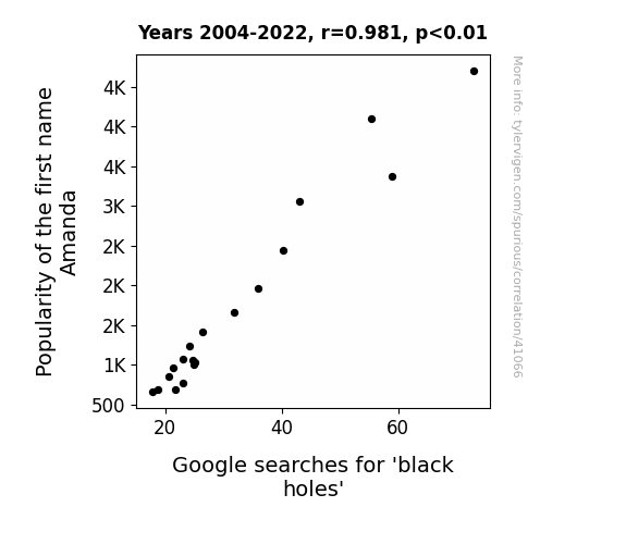 This means 96.2% of the change in the one variable (i.e., Google searches for 'black holes') is predictable based on the change in the other (i.e., Popularity of the first name Amanda) over the 19 years from 2004 through 2022.