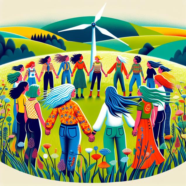 User prompt: Please respond with an image generation prompt that would be likely to create an interesting visual using DALLE-3, using the following style: [ Pop art ] and depicting this scene: In a picturesque meadow in the United Kingdom, a group of people named Eleanor are gathered together, holding hands in a circle. The wind is strong, and the blades of a nearby wind turbine are spinning swiftly, generating a significant amount of renewable energy. The Eleanors are smiling and laughing as they feel the fresh wind on their faces, showing their strong connection and support for wind power. Keep the visual depiction simple. Do not include any words or speech bubbles.