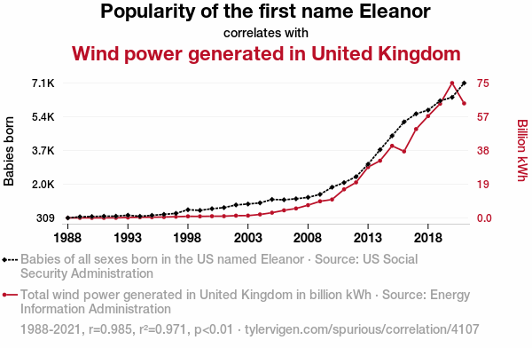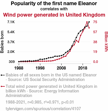 - The spurious research paper: Blowin' in the Eleanor: The Winds of Name Popularity and Wind Power Generation in the United Kingdom