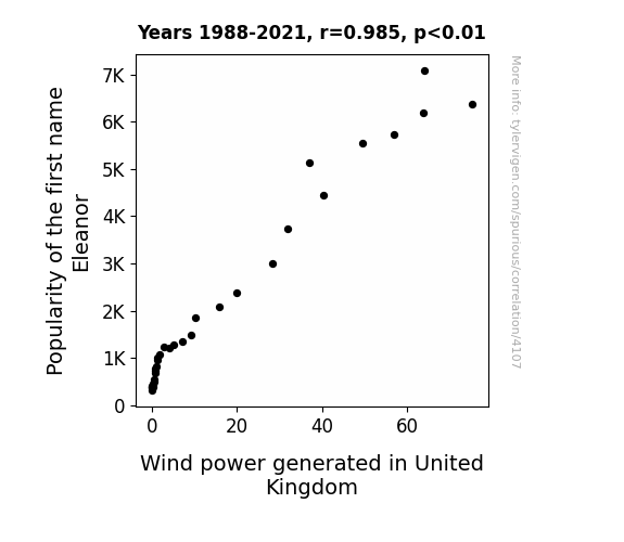 The data analysis revealed a strong and statistically significant correlation between the popularity of the first name Eleanor and the wind power generated in the United Kingdom from 1988 to 2021. The correlation coefficient of 0.9852185 indicates a nearly perfect positive relationship between these two variables. The r-squared value of 0.9706554 further supports the robustness of this association, explaining approximately 97% of the variation in wind power generation based on the frequency of the name Eleanor.
