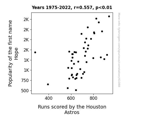 This means 31% of the change in the one variable (i.e., Runs scored by the Houston Astros) is predictable based on the change in the other (i.e., Popularity of the first name Hope) over the 48 years from 1975 through 2022.
