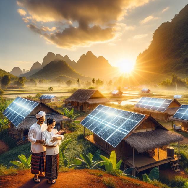 Prompt: [ Realistic ] In a tranquil village in Laos, a bright field of solar panels glistens under the golden sun. The panels, installed in secret, generate enough solar power to light up homes and streets. At the same time, a newborn named Treasure brings a smile to their parents' faces, adding to the growing number of children with the radiant name. The solar panels, like precious treasures, quietly and diligently harness the sunlight, fueling a sustainable and brilliant future for Laos. The image depicts a serene rural landscape with traditional Lao houses nestled among lush greenery and mountains in the background. The solar panels stand out in the foreground, reflecting the warm glow of the sun as it sets behind the village, casting a golden hue over the scene. Amidst this setting, a proud couple holds their newborn, Treasure, symbolizing hope and a bright future. The depiction should include only scenes, people, and objects, it should not include text or speech bubbles.