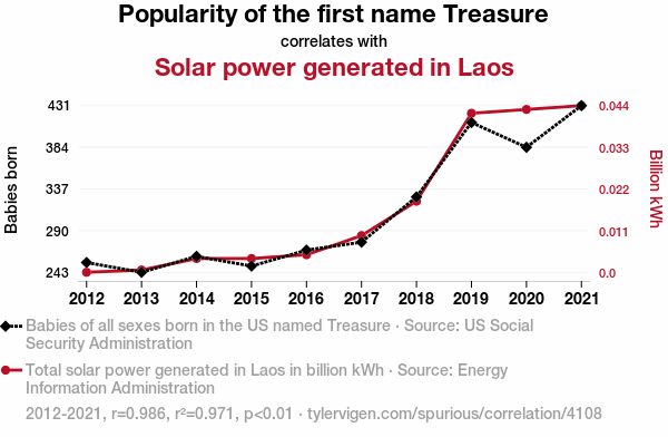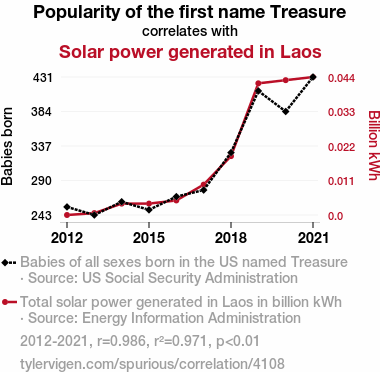 User prompt: Please make up a funny explanation for how an increase in Popularity of the first name Treasure caused Solar power generated in Laos to increase.