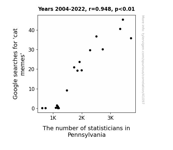 This means 89.8% of the change in the one variable (i.e., The number of statisticians in Pennsylvania) is predictable based on the change in the other (i.e., Google searches for 'cat memes') over the 19 years from 2004 through 2022.