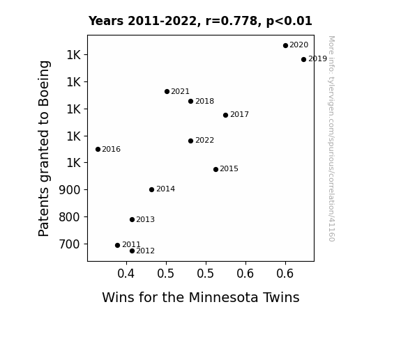This means 60.5% of the change in the one variable (i.e., Wins for the Minnesota Twins) is predictable based on the change in the other (i.e., Patents granted to Boeing) over the 12 years from 2011 through 2022.