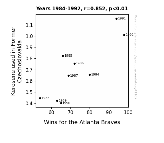 This means 72.7% of the change in the one variable (i.e., Wins for the Atlanta Braves) is predictable based on the change in the other (i.e., Kerosene used in Former Czechoslovakia) over the 9 years from 1984 through 1992.
