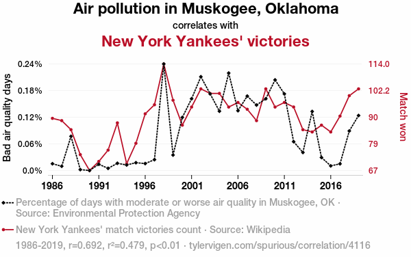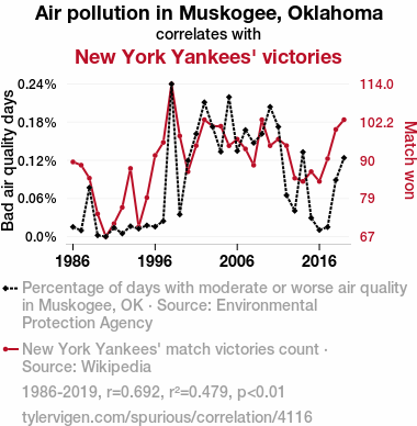 A linear line chart with years as the X-axis and two variables on the Y-axis. The first variable is Air pollution in Muskogee, Oklahoma and the second variable is New York Yankees' victories.  The chart goes from 1986 to 2019, and the two variables track closely in value over that time. Small Image
