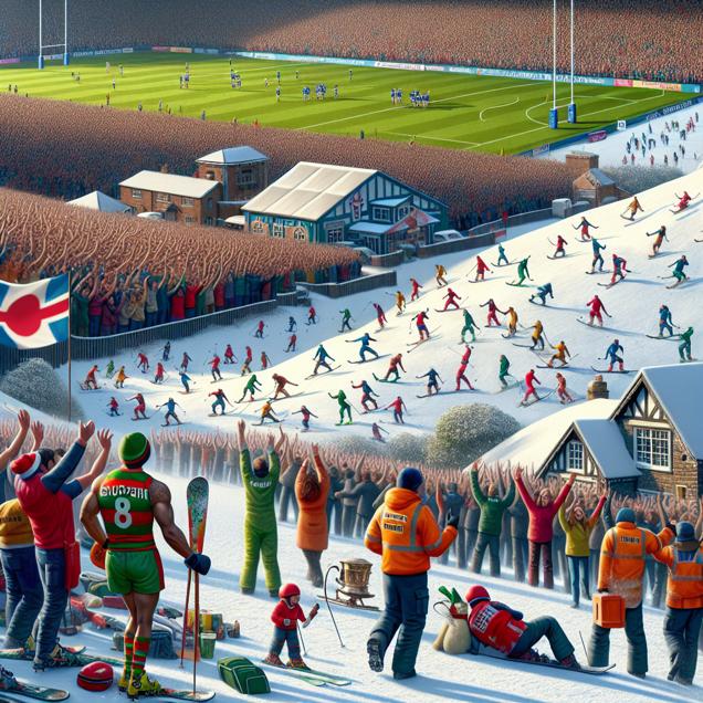User prompt: Please respond with an image generation prompt that would be likely to create an interesting visual using DALLE-3, using the following style: [ Realistic ] and depicting this scene: As the Anglo-Welsh Cup final reaches a nail-biting climax, the winning team gains a significant lead, sending the fans into a frenzy. Meanwhile, in Delaware, the slopes become crowded as a sudden surge of skiers and snowboarders take to the snow-covered hills. The influx of winter sports enthusiasts leads to an unprecedented demand for lifeguards and ski patrol in the state, creating an unexpected but necessary response to the newfound excitement. Keep the visual depiction simple. Do not include any words or speech bubbles.