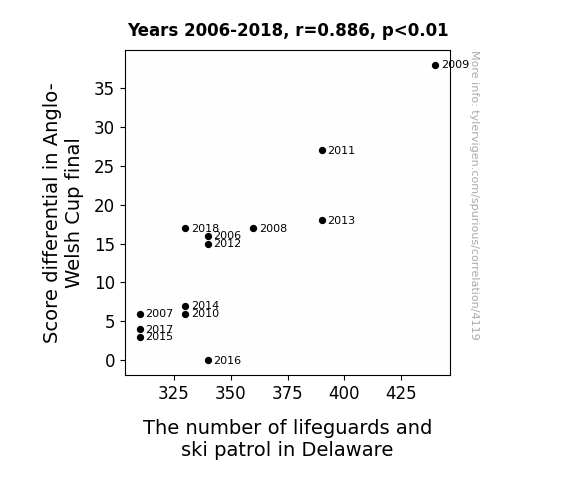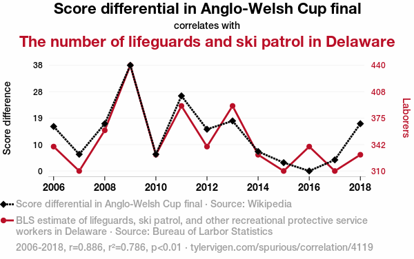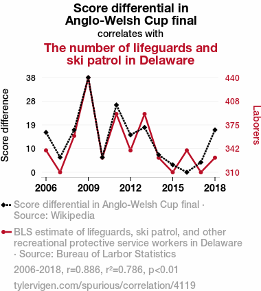 - The spurious research paper: Guarding Scores: A Dive into the Correlation Between Anglo-Welsh Cup Final Score Differential and Lifeguard/Ski Patrol Numbers in Delaware