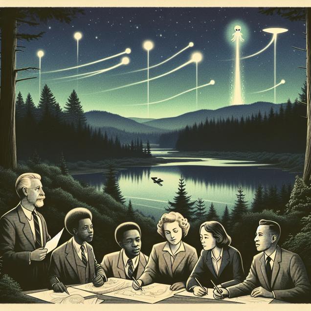 ChatGPT: Style: a stylized, vintage Polaroid photo Scene: In a serene Oregon landscape, strange lights dance in the night sky, leaving curious trails in their wake. Below, inventors strolling through a tranquil forest suddenly stop in awe as bright ideas illuminate their minds. They quickly sketch out their inspired inventions, eager to submit their patents for groundbreaking new technologies. Enhanced Prompt: Generate an image showing a vintage Polaroid photo of a serene Oregon landscape at night. In the sky, peculiar lights dance and leave distinctive trails behind. Meanwhile, on the forest floor, a group of inventors pauses in awe as bright ideas seem to illuminate their minds. Show them hurriedly sketching out their inspired inventions, surrounded by the tranquil beauty of the forest.