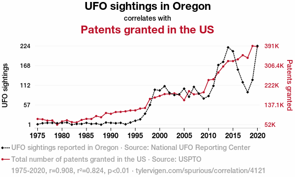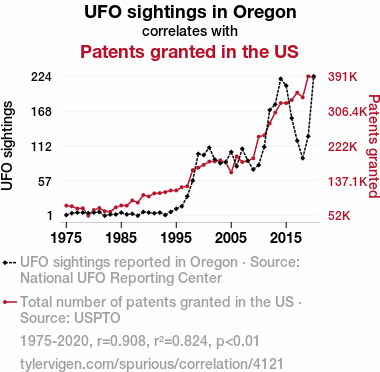 Your research team used data from National UFO Reporting Center and USPTO to assess this nagging question. You found a correlation coefficient of 0.9077341 and p < 0.01 for 1975 to 2020.