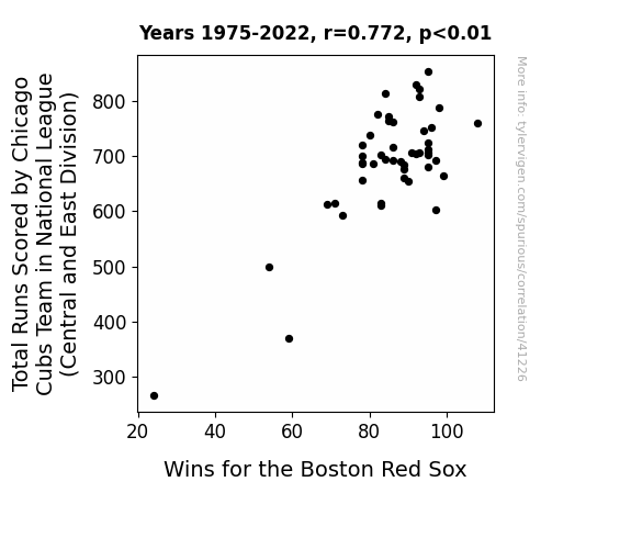 This means 59.6% of the change in the one variable (i.e., Wins for the Boston Red Sox) is predictable based on the change in the other (i.e., Total Runs Scored by Chicago Cubs Team in National League (Central and East Division)) over the 48 years from 1975 through 2022.